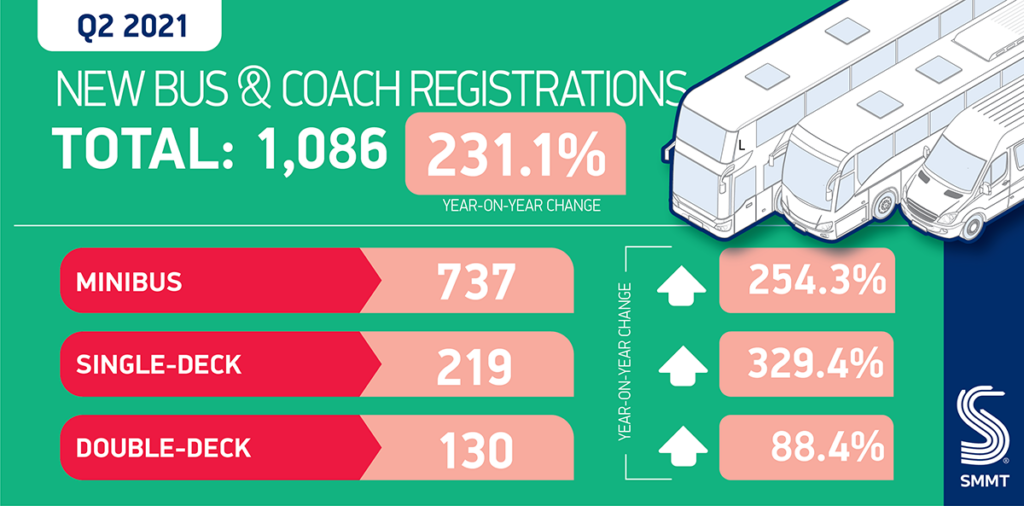 The UK new bus and coach market grew by 231.1% in the second quarter after a near standstill in 2020, according to figures released today by the Society of Motor Manufacturers and Traders (SMMT).