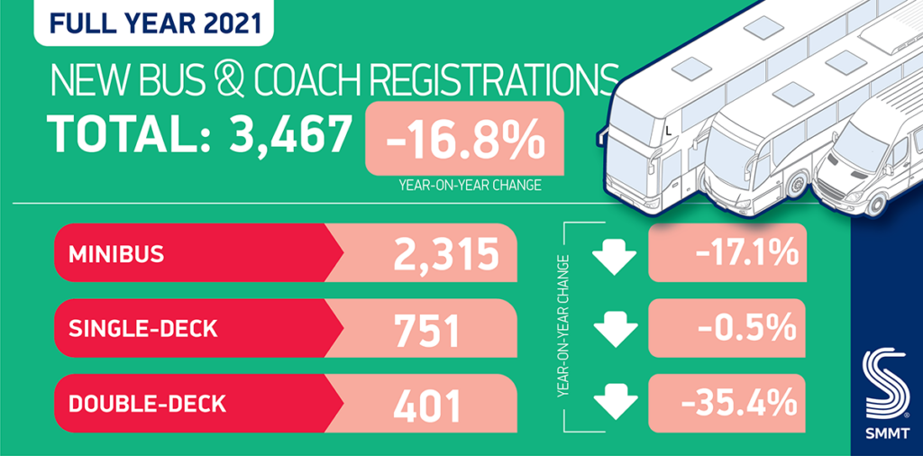 - Demand for new buses and coaches drops -16.8% in 2021, with only 3,467 vehicles joining UK roads.