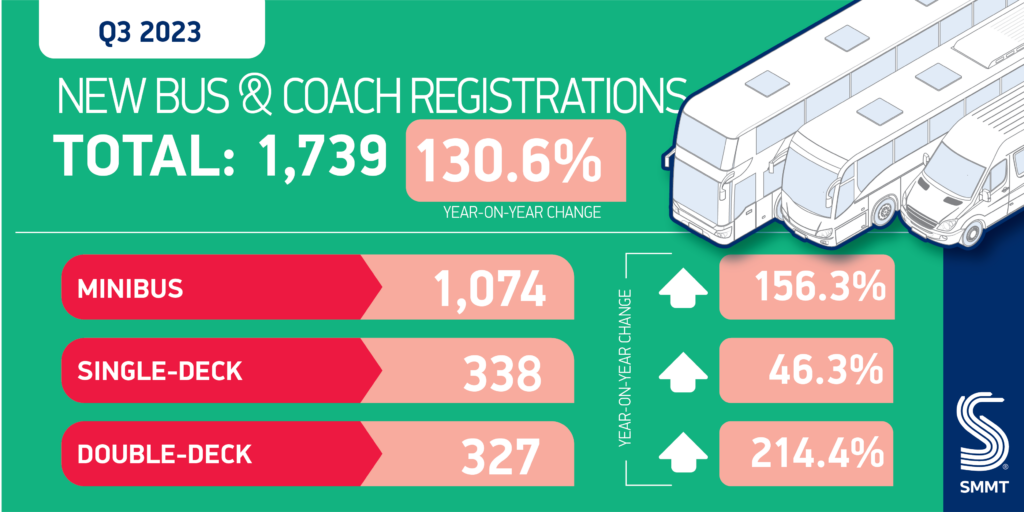- UK operator demand for new buses, coaches and minibuses more than doubles in Q3 2023, up 130.6%, with 1,739 vehicles joining Britain’s road transport network.