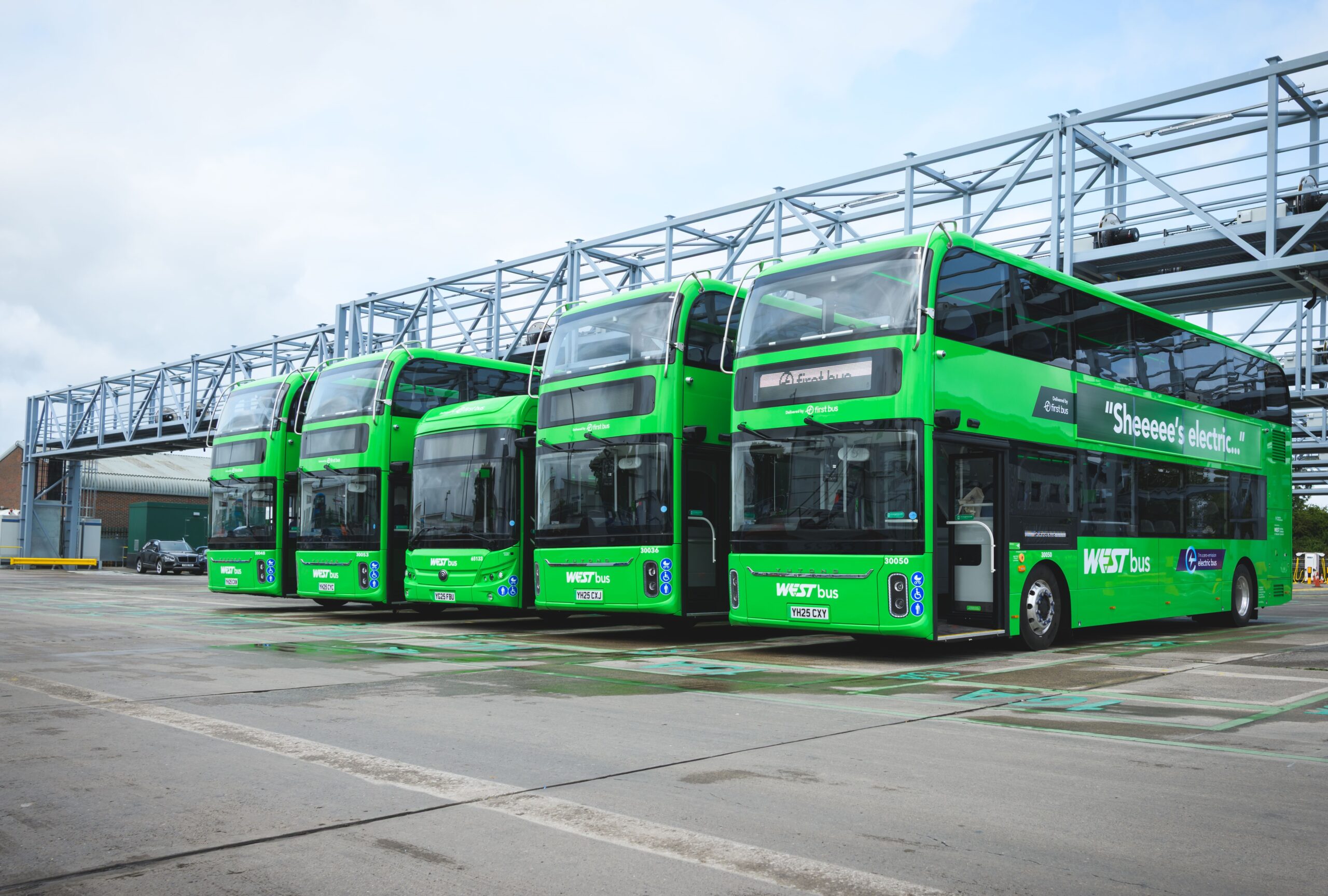 The depot now includes three huge gantries, installed by Magnus Construction Group, at the two-football pitch-sized site just off the A370 on the edge of the town, which will power the area’s 24 new electric buses – more than a third of First Bus’s Weston bus fleet.