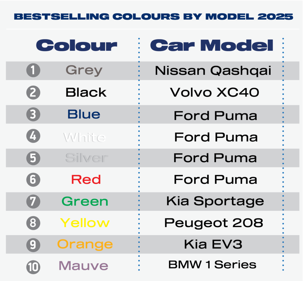 Black retained second place with 464,369 new registrations – its highest volume since 2019 – after a robust 9.7% increase on last year. Blue came in at number three for the second time, confirming its status as the nation’s top non-monochrome choice, with 306,349 registrations (up 4.9%). Together, the top three accounted for nearly two thirds (65.8%) of all new cars joining UK roads in 2025.