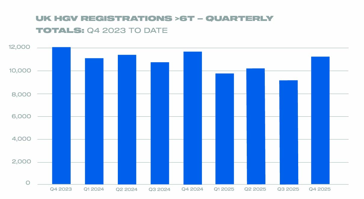 New heavy goods vehicle (HGV) registrations declined by -10.0% in 2025 with 40,504 new trucks joining UK roads, according to the latest data published by the Society of Motor Manufacturers and Traders (SMMT). The market contracted every quarter last year, reflecting a challenging economic backdrop and a normalising of fleet renewal after three years of sustained post-pandemic growth.1