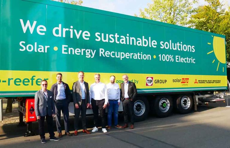 TIP Group, in collaboration with SolarEdge e-Mobility and Mitsubishi Heavy Industries Thermal Transport Europe GmbH, is currently trialling an electric refrigerated trailer powered by renewable energy.