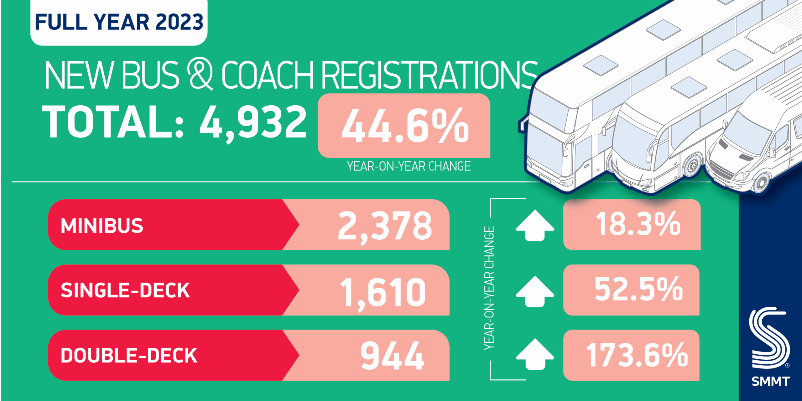 - Demand for new buses, coaches and minibuses reaches highest level since the pandemic with 4,932 new units entering service in 2023.