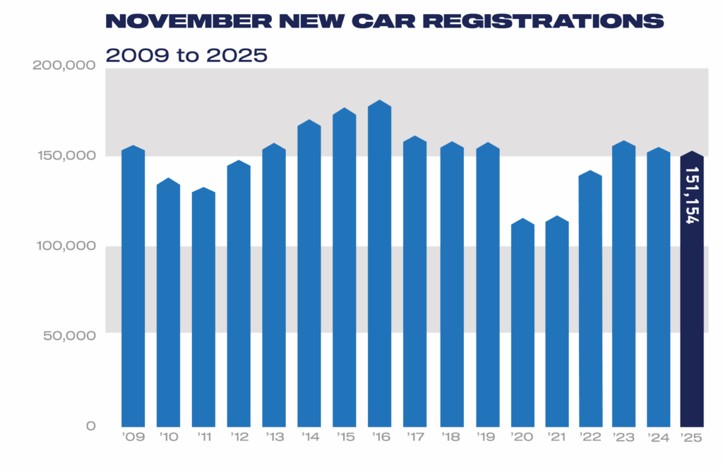 The UK new car market declined slightly in November as new registrations fell by -1.6% to 151,154 units, according to the latest figures from the Society of Motor Manufacturers and Traders (SMMT).