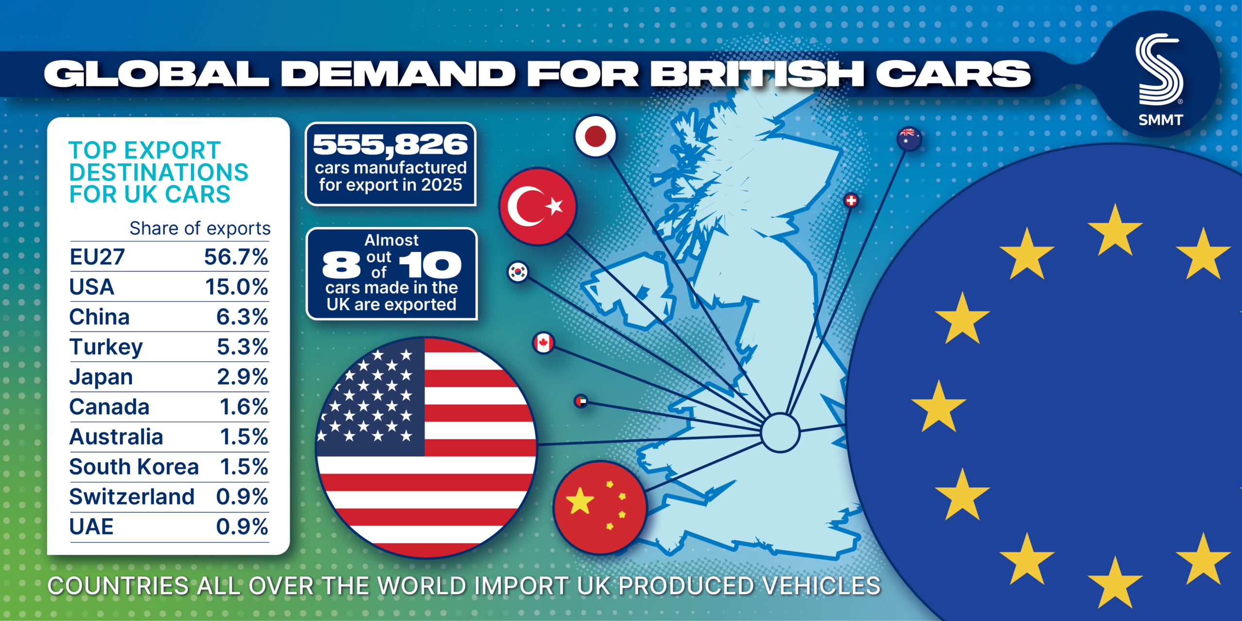 Europe received the majority (56.7%) of vehicles exported, followed by the US (15.0%) and China (6.3%). Exports to each were down, by -3.3%, -18.3% and -12.5% respectively – with shipments to the US impacted by tariff uncertainty earlier in 2025. Turkey and Japan rounded off the UK’s top five global export markets, followed by Canada, Australia, South Korea, Switzerland and UAE.