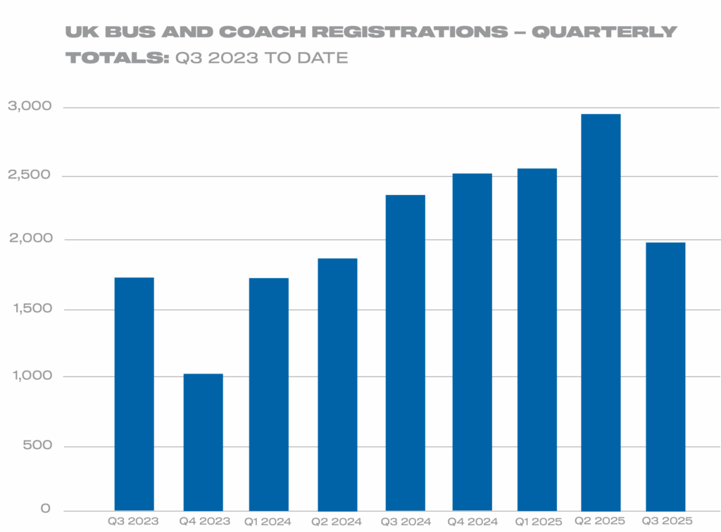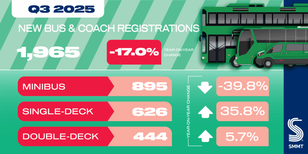 UK registrations of new buses, coaches and minibuses fell -17.0% in the third quarter of 2025, reaching 1,965 units, according to the latest figures published by the Society of Motor Manufacturers and Traders (SMMT). The decline marks the end of nine consecutive quarters of growth, with falling minibus registrations chiefly responsible, volumes down -39.8% to 895 units following strong growth in the same period last year. Single and double-deck bus and coach registrations, however, both rose – up 35.8% and 5.7% to 626 and 444 units respectively.